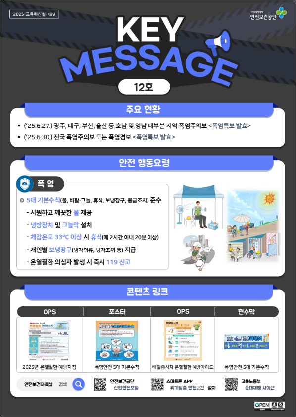 안전보건공단 안전보건자료실에 키메세지(12호_폭염) 자료가 게시되었습니다.