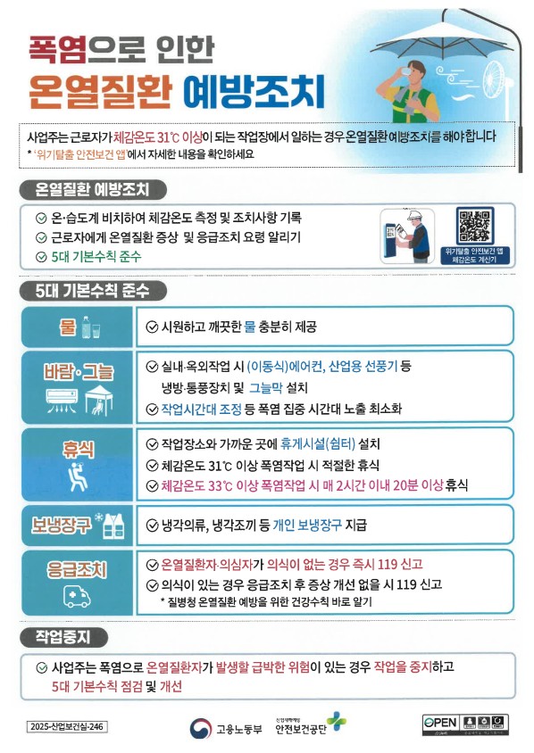 [고용노동부] 온열질환예방지침 및 폭염안전 5대 기본수칙 자율점검표 안내